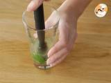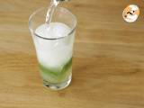 En un vaso de cristal, poner las hojas de menta + jugo de lima + sirope de azúcar de caña. Con la ayuda de un machacador de cóctel (o un machacador para mortero) aplasta la mezcla con la finalidad de liberar el aroma de la aromatizar la menta.