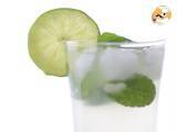 En un vaso de cristal, poner las hojas de menta + jugo de lima + sirope de azúcar de caña. Con la ayuda de un machacador de cóctel (o un machacador para mortero) aplasta la mezcla con la finalidad de liberar el aroma de la aromatizar la menta.- Añadir el ron + hielos + agua con gas hasta llegar al borde del vaso.